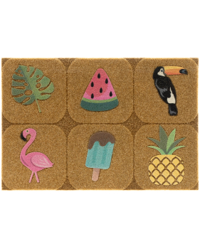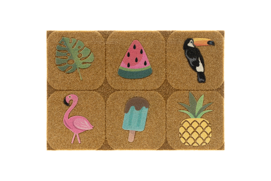 Lo zerbino Icon è disponibile in due pratiche dimensioni ed è realizzato in gomma termoplastica e poliestere agugliato. I motivi decorativi – come cactus, animali e frutta – sono stampati con dettagli tridimensionali ottenuti tramite incisione laser, per un effetto visivo sorprendente. La superficie non perde peluria e mantiene nel tempo colori brillanti e definizione.